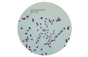 该显色培养基添加了选择性抑制剂,在显色鉴定上进行了改进。该培养基富含营养因子,同时具有高度选择性。22-32℃培养24-48小时后,显色剂被耶尔森菌裂解,使耶尔森菌菌落为紫色,其他菌被抑制生长或者菌落为无色。